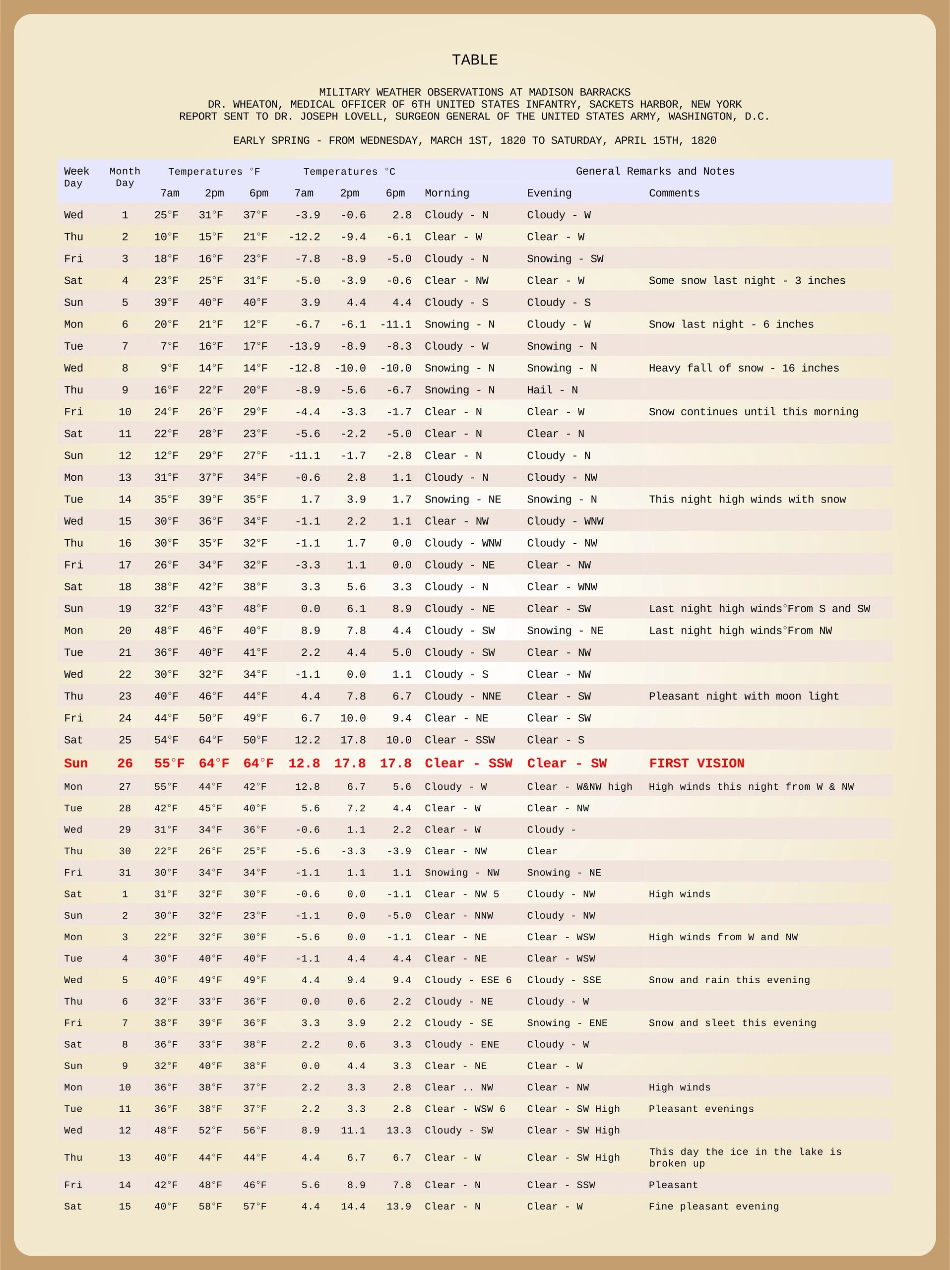 The above chart shows 7:00 a.m. weather conditions at Madison Barracks, Sackets Harbor, New York from March 1st to April 15th, 1820.