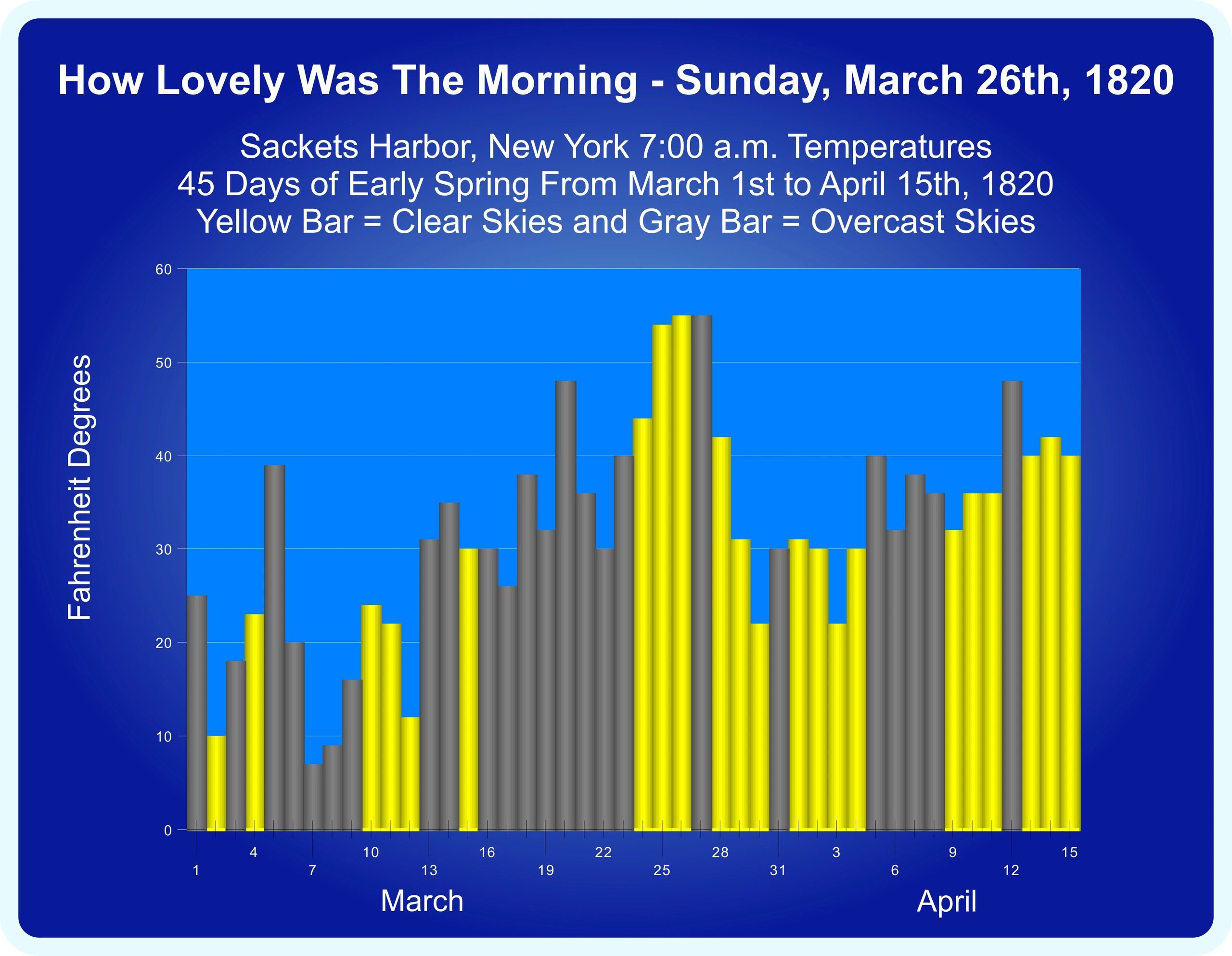 Dr. Wheaton recorded the highest monthly temperatures in the Early Spring of 1820 for Sunday, March 26th, 1820. He also noted that the skies for that day were clear. This day is by far the most beautiful day in upstate New York for the 45-day period of Early Spring 1820.